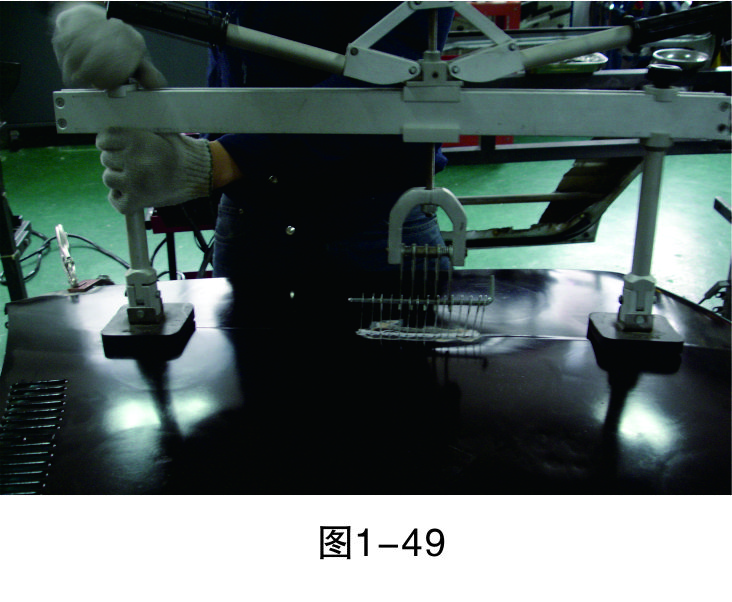 步驟6(穿進L形鐵):在介子中穿入L形鐵,以便整形架的拉鉤能固定在上面進行拉伸作業,如圖1-47所示。