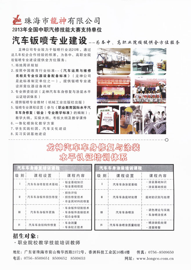 龍神公司專業致力于鈑噴行業近20年,通過這幾年校企合作經驗的積累,為各中、高職業院校鈑噴專業建設提供全方位服務:
