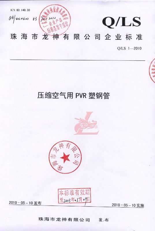 龍神壓縮空氣PVR塑鋼管成功申請企業執行標準 2010年5月珠海市龍神有限公司“壓縮空氣PVR塑鋼管”得到珠海市質量技術監督局認可,特此頒發“壓縮空氣PVR塑鋼管企業執行標準”,龍神公司在嚴格執行標準下,保證產品質量。 2010-05-20 10053