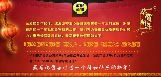 2014年春節放假通知 2014-01-16 10785 親愛的合作伙伴,珠海龍神衷心感謝您在過去一年里的支持,期望在新的一年里我們更密切的合作,我們將為提供更優質的服務而努力!春節長假即將來臨,我司春節放假通知如下:1月26日至2月8日(初九),2月9日(星期六)正式上班。特別提示貨運公司將于1月25日后停止發貨,如需訂貨請于1月25日前傳真至0756-8509650,謝謝您的合作!最后祝愿各位過一個祥和快樂的新年!